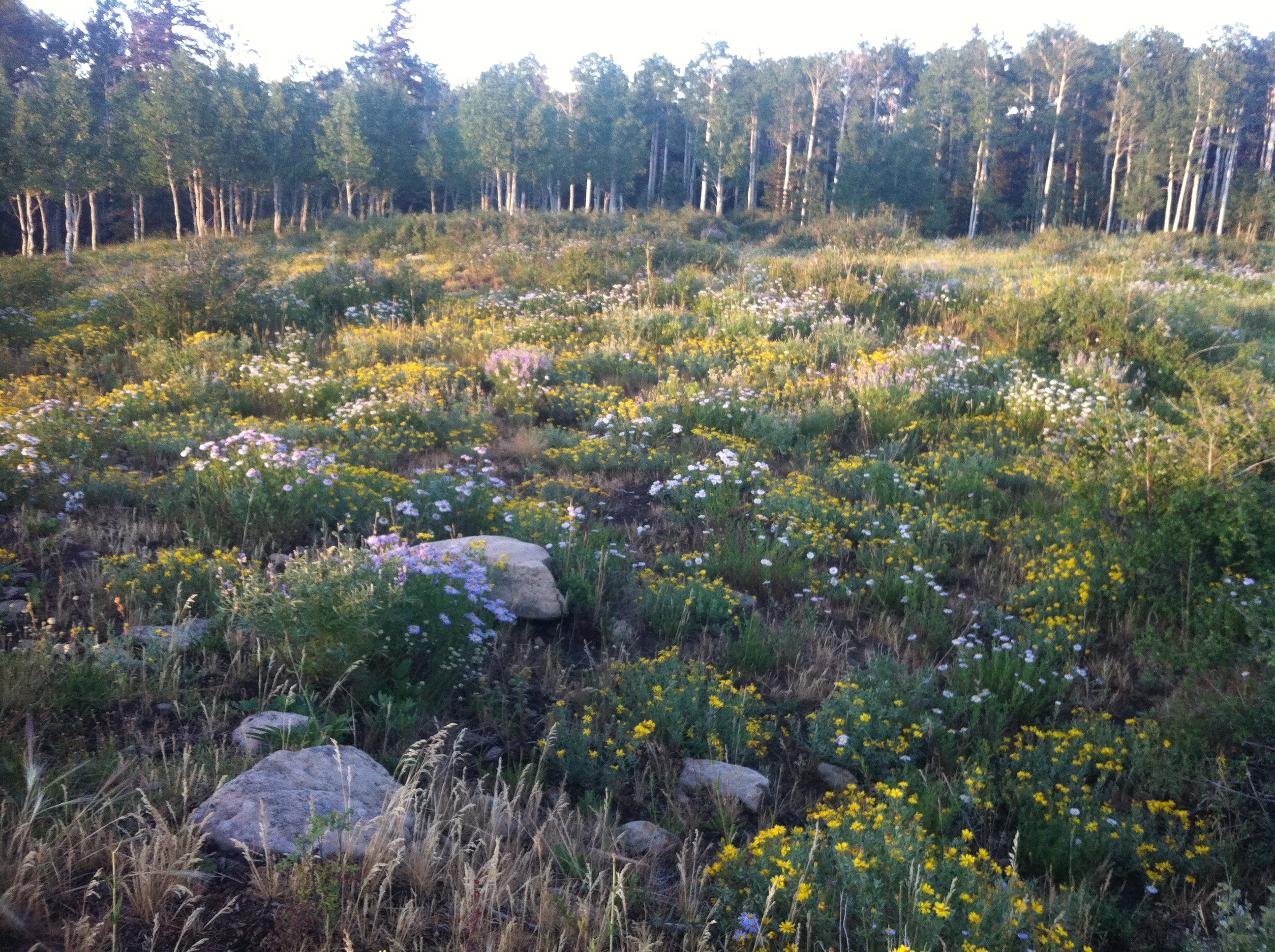 I have also maintained my practice of doing awesome stuff every weekend. This past one, I camped the first night in Delldengallen (which deserves to be on a map) with Mike, where we spent most of our time walking around in the aspens and wildflowers saying, “This is amazing. This is so beautiful. This is great. This is so amazing.” We heard a bajillion elk; I’m very glad Mike was there, because I think I would’ve taken the noises as some weirdo bird call if he hadn’t translated it for me. I did some yoga on a rock; we met a very pregnant pug at the Glade Park Store; I learned more about fire starting techniques. It was superb.