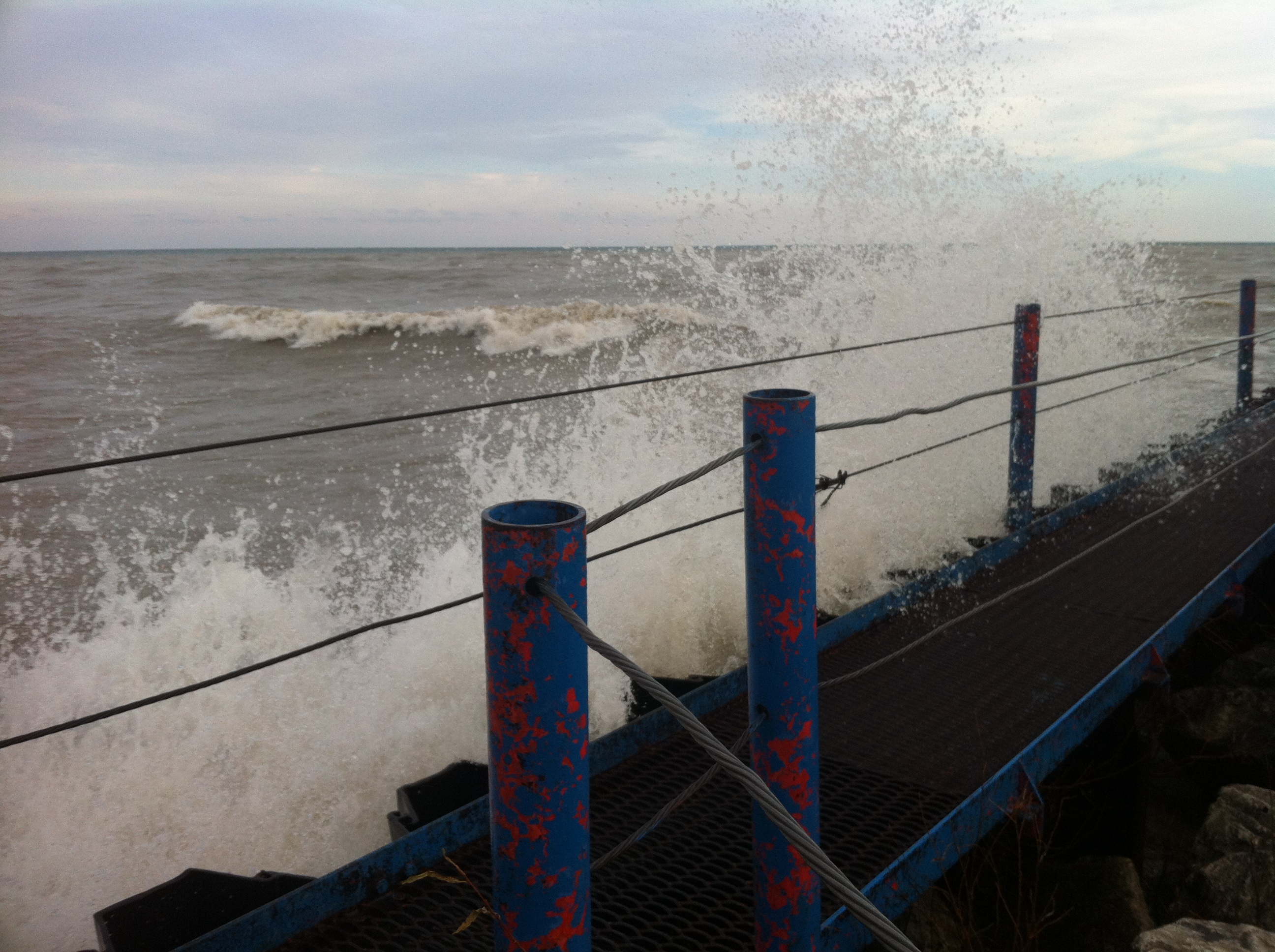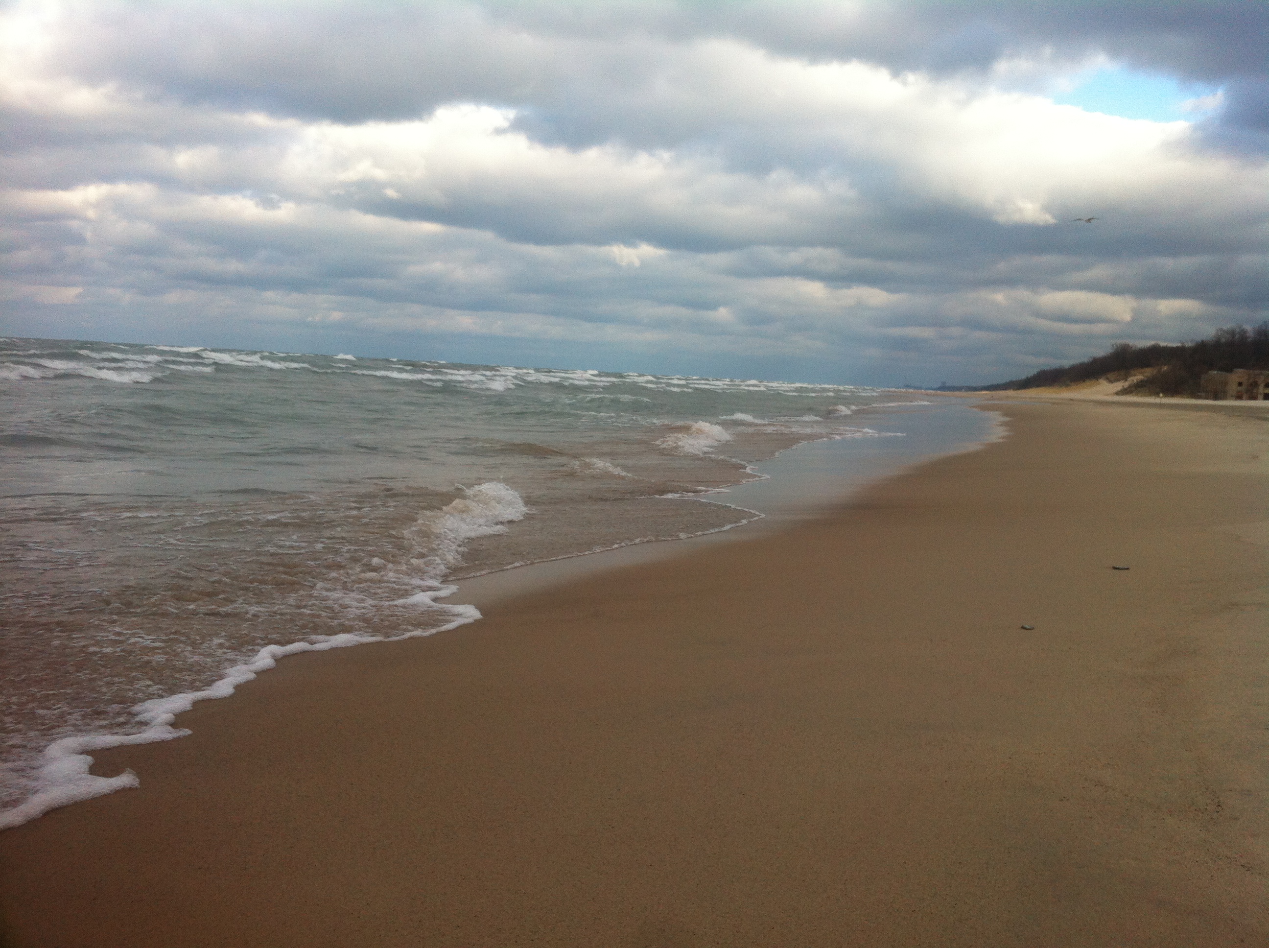 From there, I toodled back through rural Wisconsin (flat and full of dead, golden-gray cornstalks at this time of year) and then continued to make my way along Lake Michigan. At Port Washington, I walked out along a breakwall and got enthusiastically drenched by enormous waves that roared up sounding like tornadoes or freight trains or angry dragons and covered me from head-to-toe in spray that was not-quite-ice, which made me laugh, like a toddler playing in a sprinkler. (I dried out later, with the heat in my car on full-blast.) It was brilliant to see the lake from the other side; at one point, I was standing directly across from Nordhouse Dunes, my favorite place in the world. Everywhere, the colors were muted but magnificent: a subtly complex palette of grays and pastels.