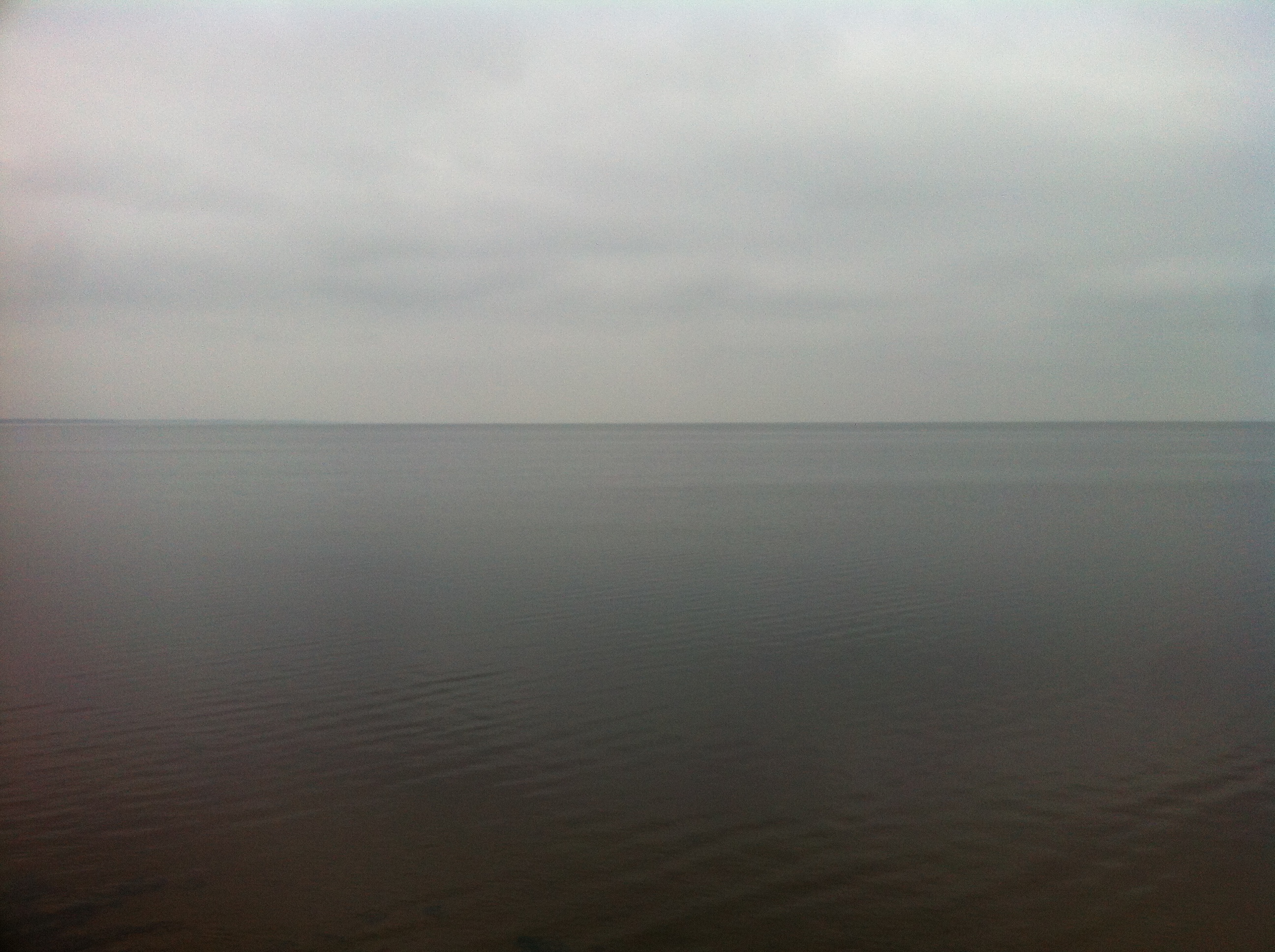 The cold I had was insatiable, though, and so I cut the circumnavigation short. After stopping at the beach along Highway 2, and crossing the Bridge, and somehow successfully undergoing a Skype job interview at a Starbucks in Mackinaw City for a position in Colorado, I decided to hightail it down I-75 instead of following the lake. This did enable me to stop by Lake Huron, and add a splash of that to the Great Lakes collection I’ve got going in a jar on my dashboard. (I had a surprisingly hard time finding the lake in the dark. Wandering around the woods, I came across what I thought was Huron, but quickly realized was a pond. Finally, after pushing my way through tall, crinkly prairie grasses, I came to the muddy beach, with tiny waves barely visible on another cloudy night.)