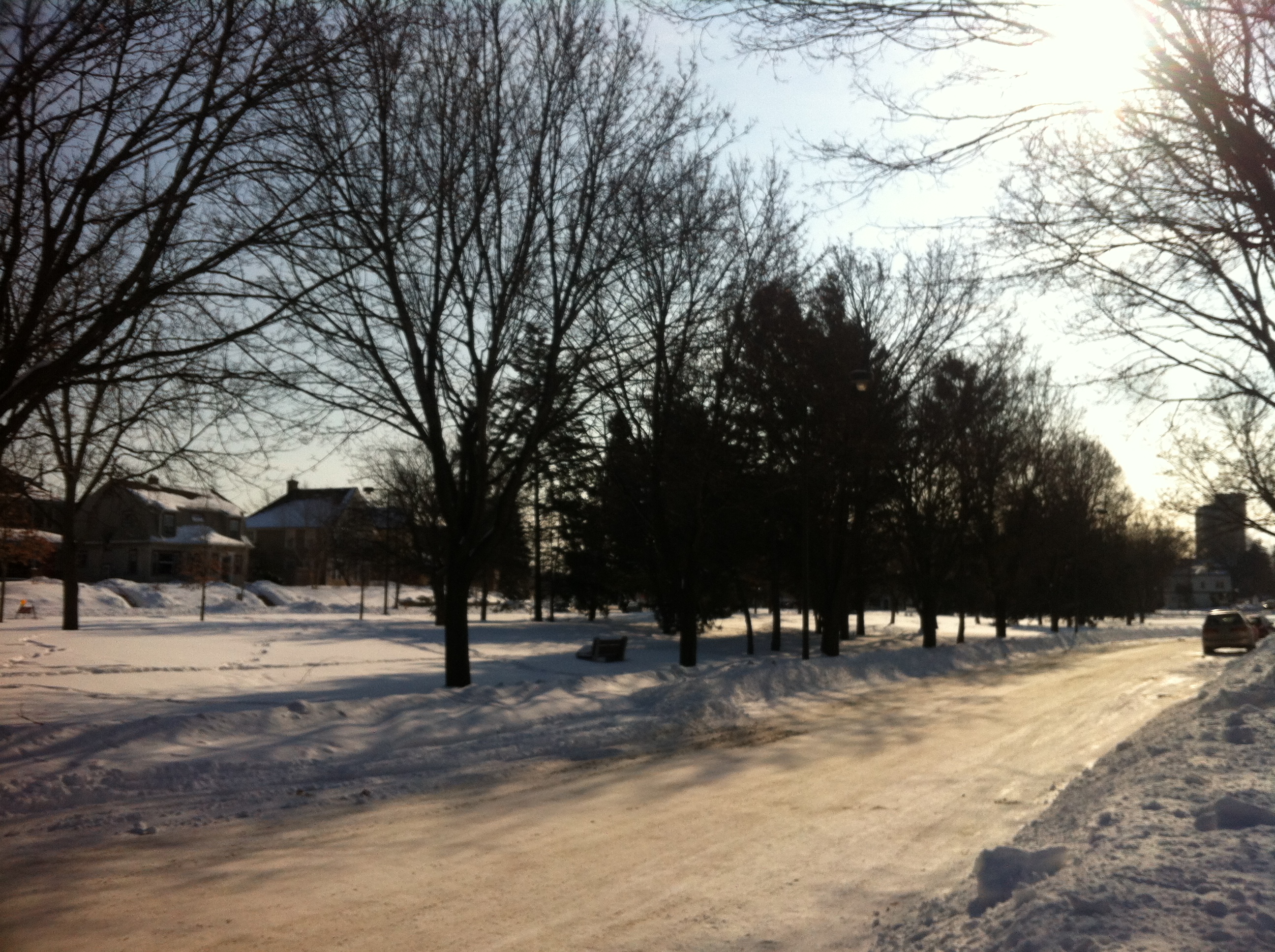 We’re by a little park, with tall trees and benches (now nearly buried in snow), and the neighborhood is all old, interesting-looking houses, with stained-glass windows and carved wooden decorations above the front porches. Very aesthetically pleasing, really. I passed an older gentleman chipping ice off the sidewalk; when I said, “That looks like hard work,” he said, “Oh, it’s not too bad; I always do Sarah’s for her too,” and then started a ten-minute explanation of his work around the neighborhood – which wasn’t tremendously enlightening, as I had no clue who any of the people he referenced are, but I was delighted by this manifestation of friendliness.