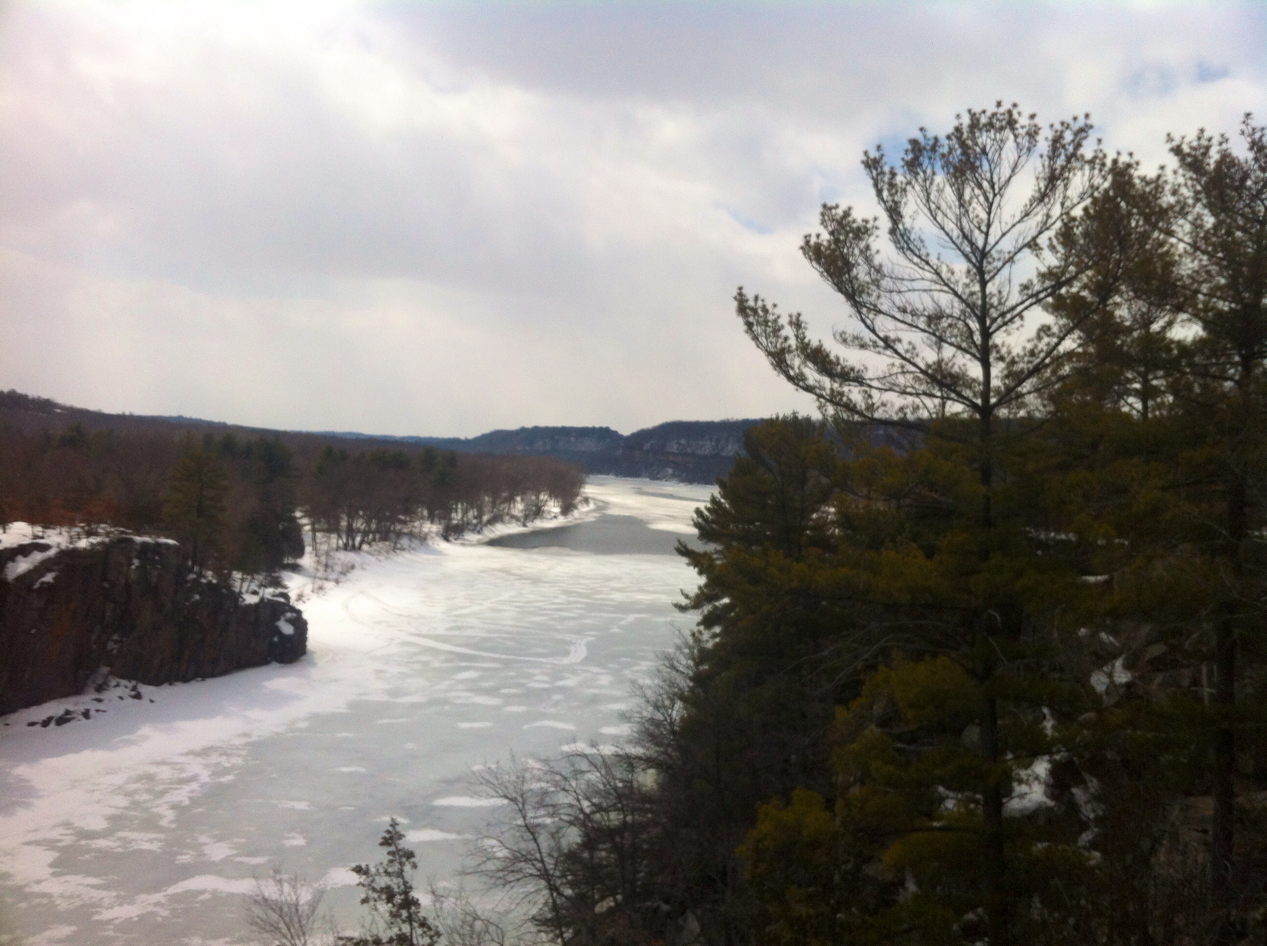 I’m pretty into solo outdoor trips for just this reason. Yesterday I explored and hiked along the St Croix River, and camped last night by myself, in the snow, in the woods. The St Croix marks the border now between Minnesota and Wisconsin, but it used to lie along a fault-line, and later became a funnel for the rush of melting glaciers, and now the river curves below giant cliffs and features smoothly rounded glacier potholes in the basalt. There were lots of scrubby oaks still hanging onto their brown leaves, and graceful white pines and northern white-cedars. I scrambled up and down icy slopes, sank through crusts of snow to my knees, and took some moments to just stare out at the flat blue-white frozen river. A little before sunset, I found myself facing a small inland lake across an expanse of unmarked snow, and the sun was beaming across all of that blankness from a broad blue sky. I faced the sun and was very still for awhile. There I was, another small living thing, dependent on a far-away ball of fire with my feet firmly planted on Earth.