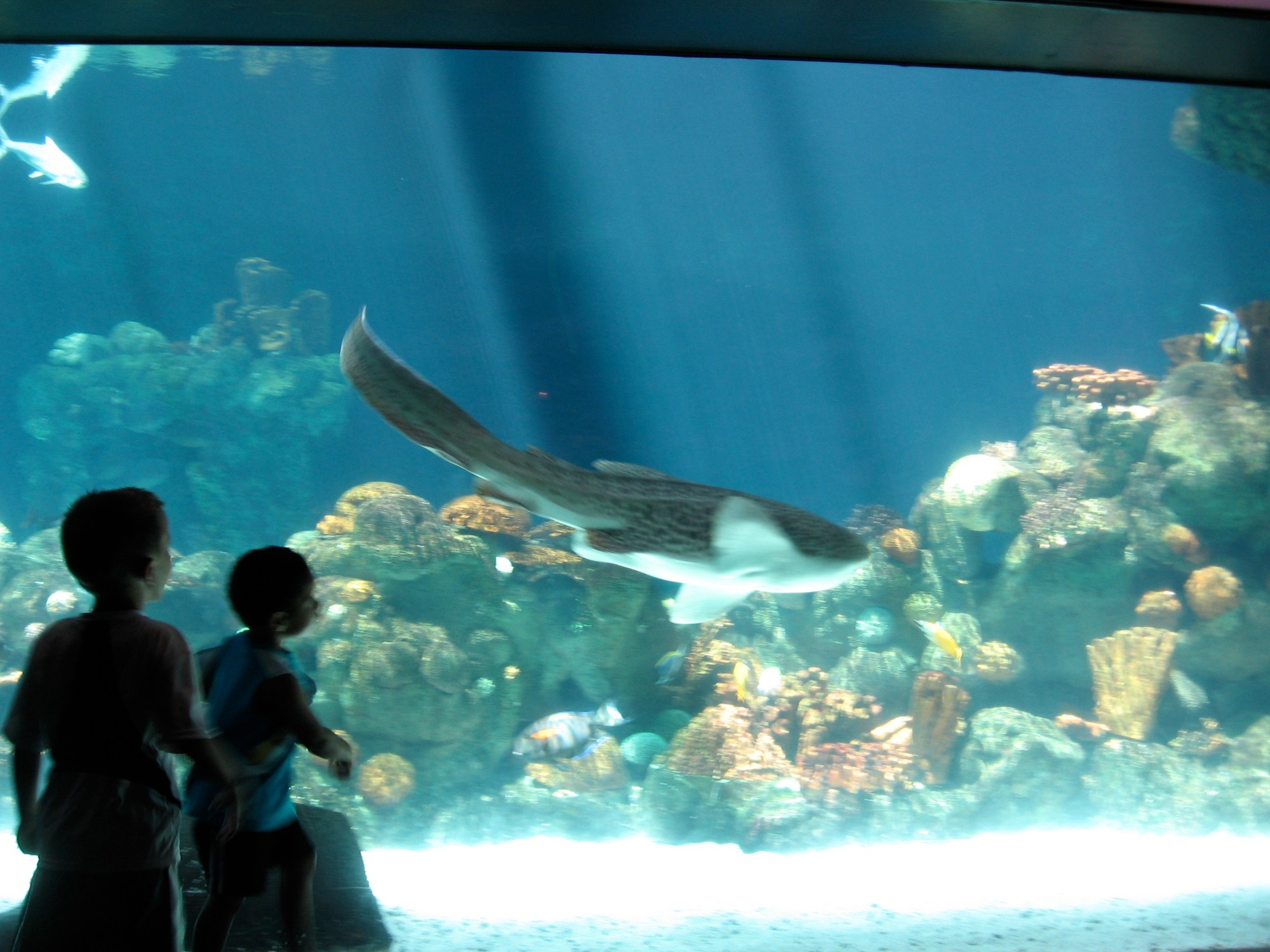We actually have three shark tanks: there is the “Pacific Reef Tank” along the Tropics Trail (which holds zebra sharks along with its tiny sea turtle and hundreds of brightly colored tropical fish), and in Discovery Bay, the “Atlantic Reef Tank” (with oceanic whitetips and sandtiger sharks, along with two medium-sized sea turtles and hundreds of large silver fish) and the “Estuary.” The Estuary holds several small rays, and three small species of shark, including leopard sharks. The Estuary is one of two “touch pools,” where people can feel the slippery backs of sharks or the stubbly surfaces of sea stars – which means all of the sharks and all of the rays (none of them, of course, a threat) spend all of their time just far enough below the surface so as to be out of the reach of a typical 4-12 year-old child.