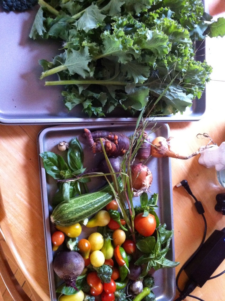 It was certainly melancholy, leaving my old house. I’d lived there for seven months and it was what I thought of as “home” in my new state. Karen and Eli were skilled, friendly, and clever roommates and tour guides and friends (and for the last two, present tense would do better than past.) I moved out over the course of several days. Eli cooked some kind of amazing thing with chanterelle mushrooms. I walked barefoot around our overflowing garden and through all of the open, wooden-floored rooms, noting the field guides and mammal skulls and pinecones. It was a beautiful house. It still is a beautiful house. And I stopped in today to have a chat and harvest a cornucopia of colorful vegetables.