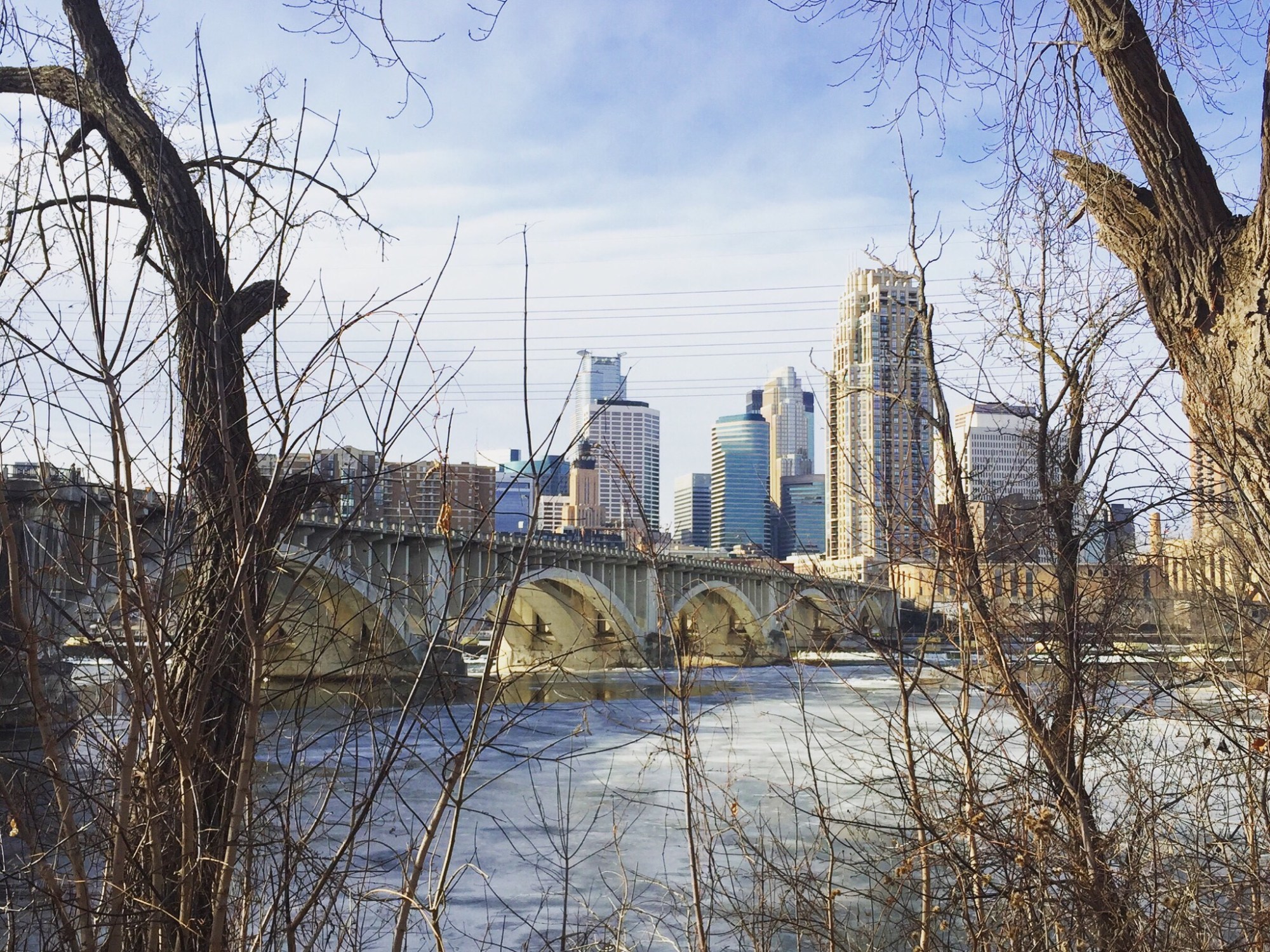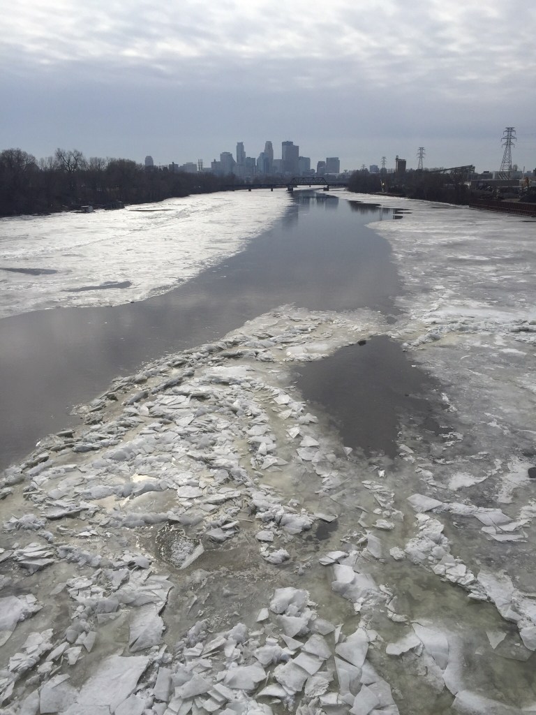 On my two-year anniversary, I decided to follow the water. I started where Minnehaha Creek spills into the Mississippi and then headed upstream, past Minnehaha Falls, following the creek to the chain of lakes and continuing north and then east until I was back at the Mississippi in downtown Minneapolis: 22 miles. This route was far more beautiful than the previous year’s, and also far more boring – instead of a range of different kinds of neighborhoods and businesses, I spent the entire day in wealthy, white, waterfront. All of the houses were big and beautiful and old, with sprawling, clean front yards. There were trendy little cafes serving espresso and gluten-free pastries, and stationary stores selling clever cards and hand-painted dish towels and clean-burning candles. The creek ran through everything, half-frozen and sprinkled with ducks. Bare willows and aspens hung slender branches over my path. When I got to the lakes I was able to walk across them, taking careful steps on the rough ice. Jane was with me by then, and she walked the rest of the route with me, until we met our gang at a cozy candlelit restaurant in Minneapolis for drinks and huge bowls of food, and I massaged my quads surreptitiously under the round table.
