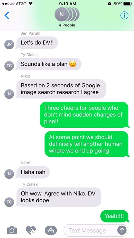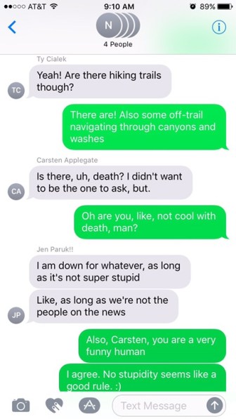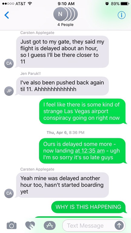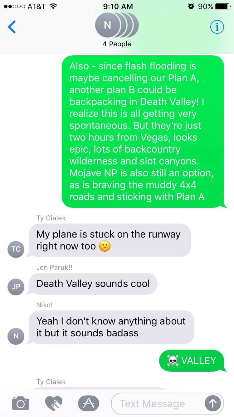Back to Google Maps. The five of us had a group text going throughout the day. Not only did we need a new Adventure Plan, we were also in the midst of the Delta Disaster of 2017; by early afternoon, even though we were converging on Vegas from four different airports, everyone’s flights already listed a delay. The group text was getting really long.