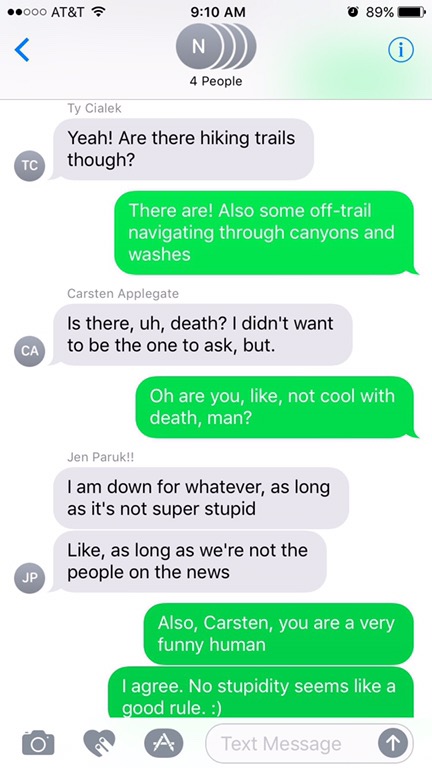 Our flights were all Thursday night, with plans to car camp that night, spend the next three days backpacking, and crash in a fancy hotel in Vegas Sunday night before our flights home on Monday. On Thursday morning, I got an email from my new ranger buddy, Amber: Roads and river crossings were already closed. The northern sections of the river, in Zion National Park, had gotten rain. We should not attempt to cross it, and she recommended heading south.