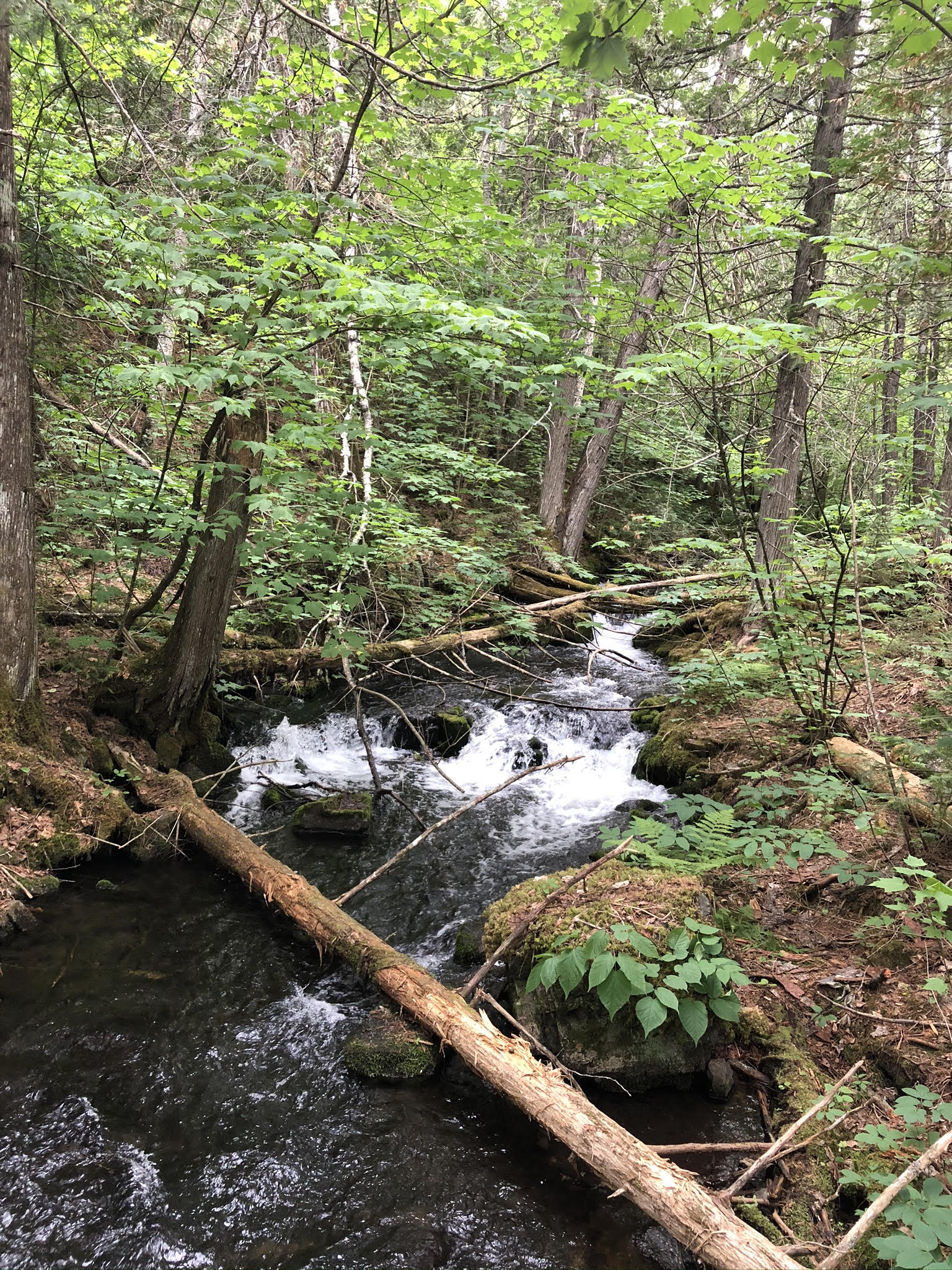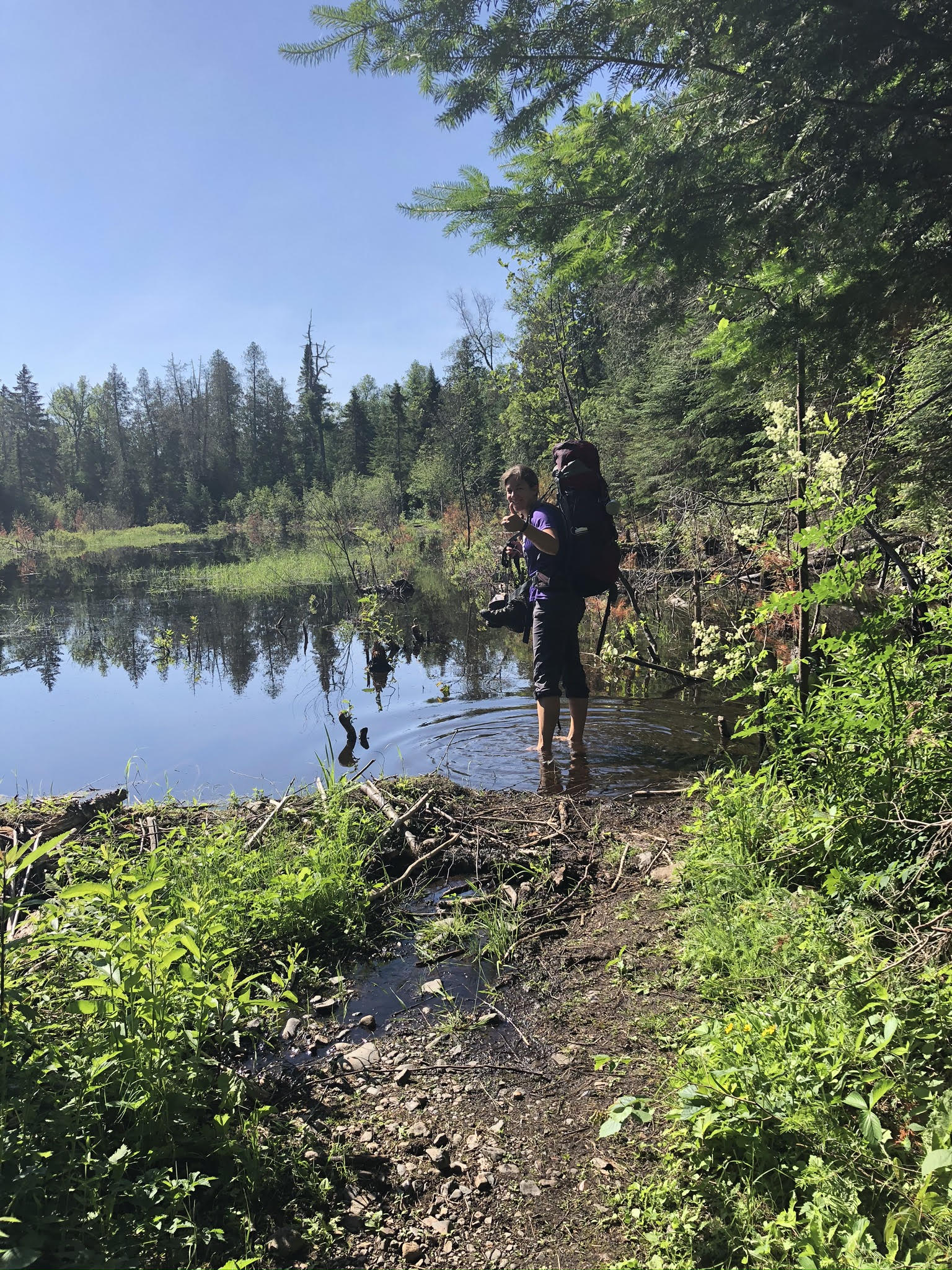 It was a fun day of trail. There was a long stretch that made use of a BWCA portage trail, and was thus better maintained than anything we’d hiked on yet. Much of it traced the actual border between the US and Canada, so that if we stepped off the trail to our left, we were in Canada; to the right, in the United States. I did this a couple times, you know, for the novelty. A burbling stream chased along us to the north for quite some time, and the ground was thick with Canada dogwood and sarsaparilla and moss. One section, that briefly overlapped with an old, gravelley, railroad grade had been completely flooded thanks to a beaver dam, so we pulled off our boots and socks and waded along it. The water was shin-deep, clear, and very warm. There was arrow-root shining in the sun and an enormous bullfrog.