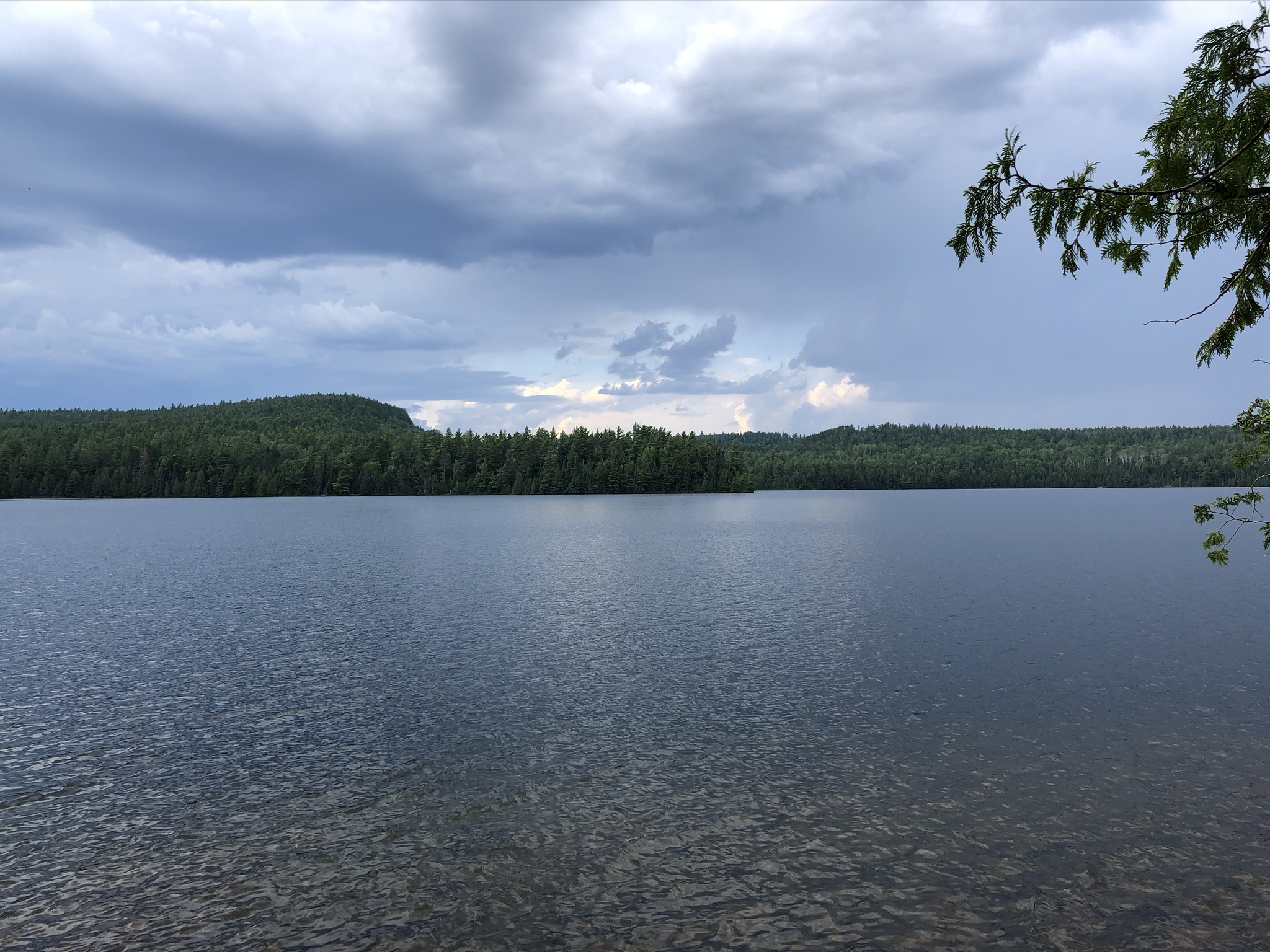 We made it to the water – it was insanely far from where they’d put the campsite – and there was nowhere to camp except right at the portage mouth. Everything else was a steep slope up away from the water, and densely wooded. Camping at portages was illegal, but we were in a sorry state, it was nearly turning into evening from afternoon, there were heavy gray clouds on the horizon, and no one was around. We pledged to pack up very early in the morning.