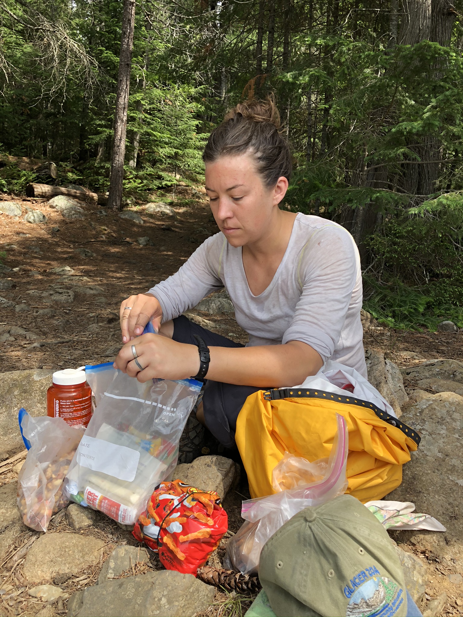 It turned out she’d eaten almost nothing all day, feeling too gross, so I made her eat a few bites of salty things. We needed electrolytes. (She revealed later, while reviewing this post actually, that she had mostly been licking her granola bar, as even eating one bite seemed too hard.) We sipped more water. We sat on the moss under the tree, and I said of course we can stop tomorrow at the campground, obviously. And we said, we’re going to make it to the campsite. And we drank more water.