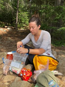 With rain clouds imminent out there, we set up our tent and tied up a tarp in the trees to make a waterproof eating area before swimming. The lake stayed shallow a long way out, with a pebbly bottom. After a swim, we made dinner on a sloping flat rock on the water’s edge, taking breaks every five minutes to re-up our bug spray. Dinner was packets of instant tomato-y pasta that we stirred tuna into. It started sprinkling by the time we were done, and we yanked on rain coats to wash dishes, hang the bear bag, re-fill the gravity filter’s sack and hang it on a tree by the tent. We tidied up camp and watched rain drops coat the lake’s still surface in polka dots. As we were messing about, a couple around our age came down the trail with the same gravity filter sack – more BRT hikers, just coming into camp after a long day on the trail. They were hiking the opposite direction of us, the same way as Ghost Woman, and had decided to disperse-camp at the top of the slope. They were friendly but efficient, scooping up water in their sleek raincoats and then disappearing back into the trees.
