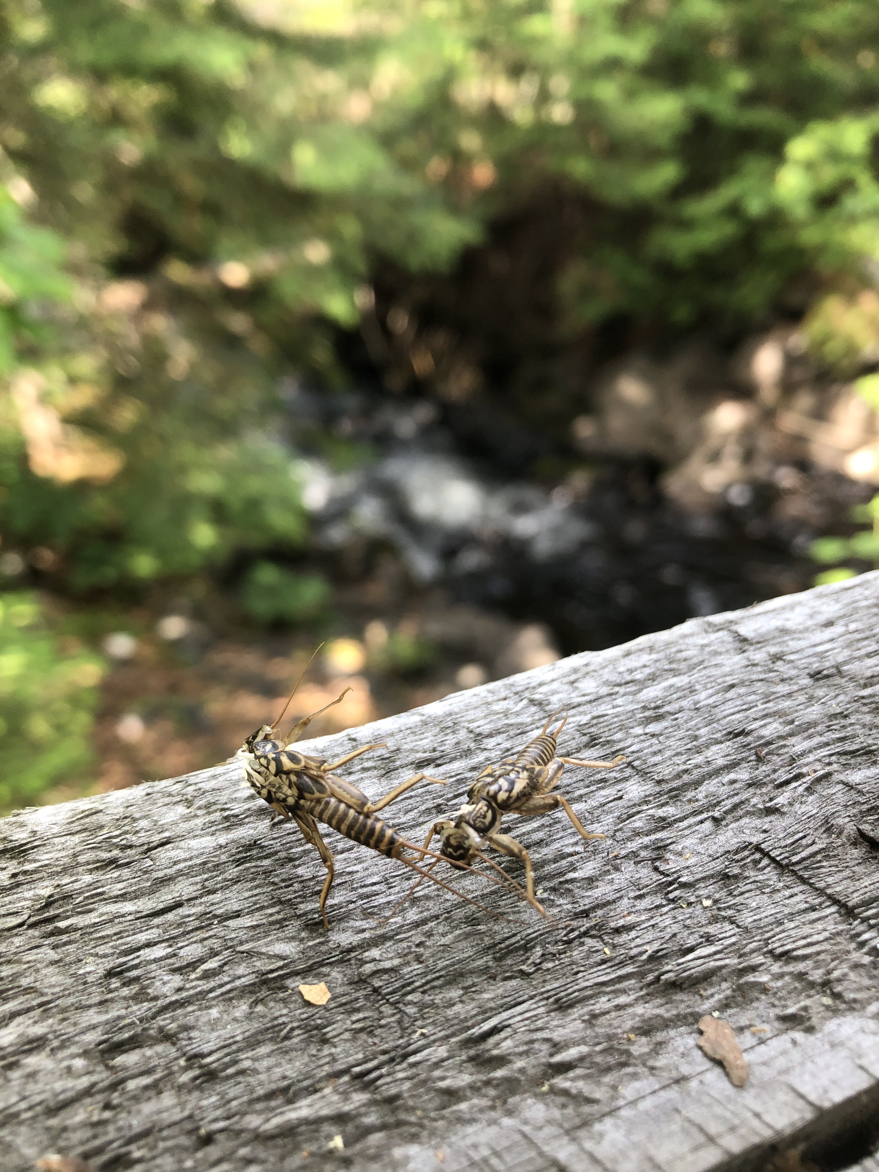 Later in the afternoon, we came to Bridal Veil Falls, a gorgeous, long strand of tiny falls in a rocky creek, with an old wooden bridge crossing. I tossed my pack and scrambled to the water with something like desperation, to scrub cold water on my face and arms. It wasn’t really cold enough – the little creek was cool but not cold, not enough to shock and clean my overheated skin. There were dried hulls of insect exoskeletons everywhere (mostly some kind of stonefly, I think – Plecoptera.) We ate more snacks and filtered water, filling up more liters for each of us – we’d been nearly out. Just before the falls, there’d been an astounding rocky cliff overlooking a sprawling forested view, and a patch of strange pink orchids.