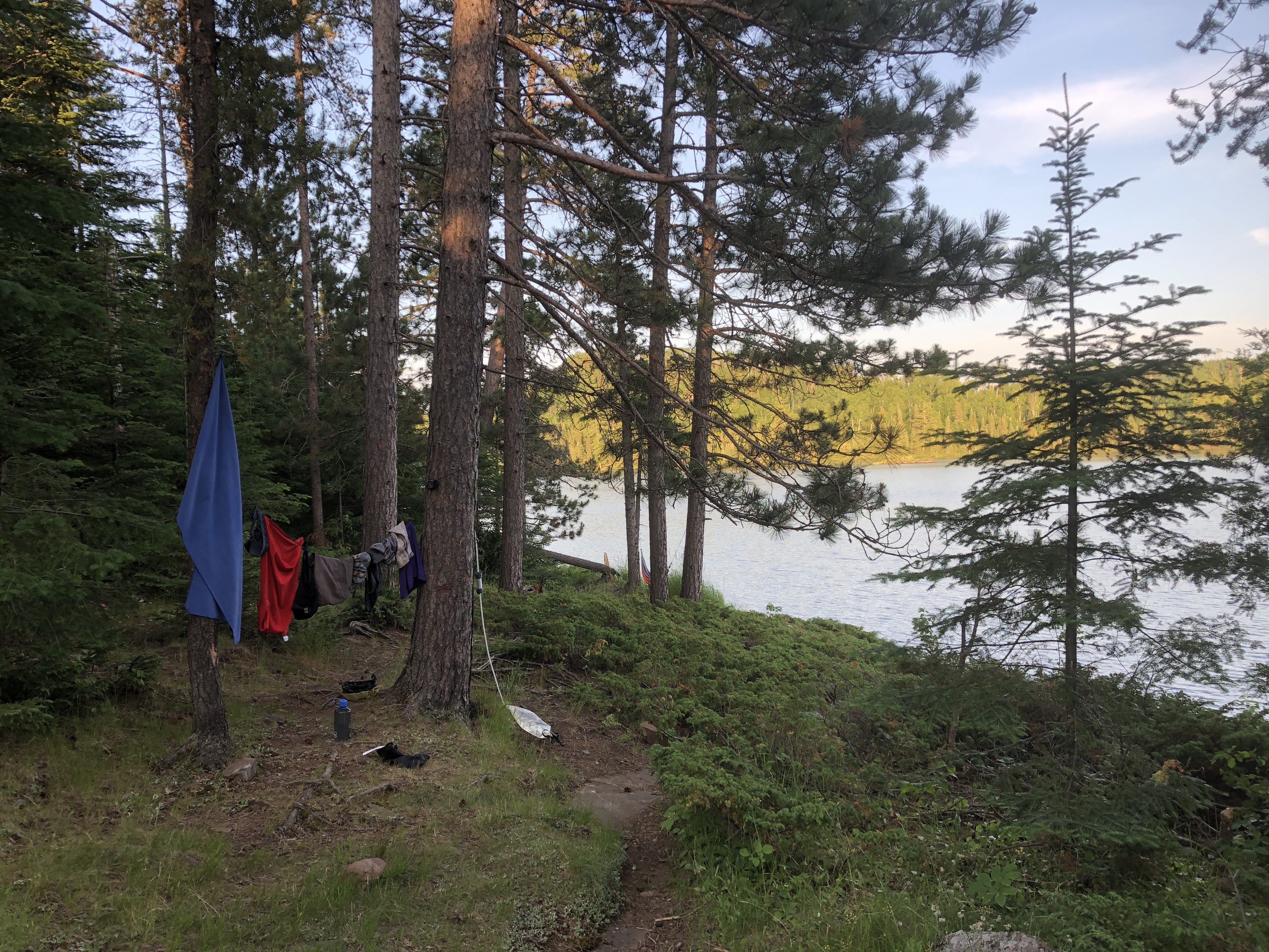 We passed the Rose Lake West site first, which looked a little dismal, clogged with fallen trees and not on the water, but the Rose Lake East site, our final destination for the day, was nicer, although it was also criss-crossed with fallen trees that blocked the view of the lake from the tent pads and cooking area. (The Border Route Trail and its campsites get far less maintenance, including clearing and cutting of deadfall, than the paddling sites and portage trails. Every portage trail we crossed or overlapped with on the trek felt like a pristine super-highway – relatively wide, well-graded, free of obstacles – although even those trails would be called rugged and tough by many.) Rose Lake itself was stunning and expansive, with tall cliffs along one shore. In our now-normal routine, we went swimming before doing anything else. It took a long time in the water before I started feeling less cooked through, less like a baked potato and more like a human again.