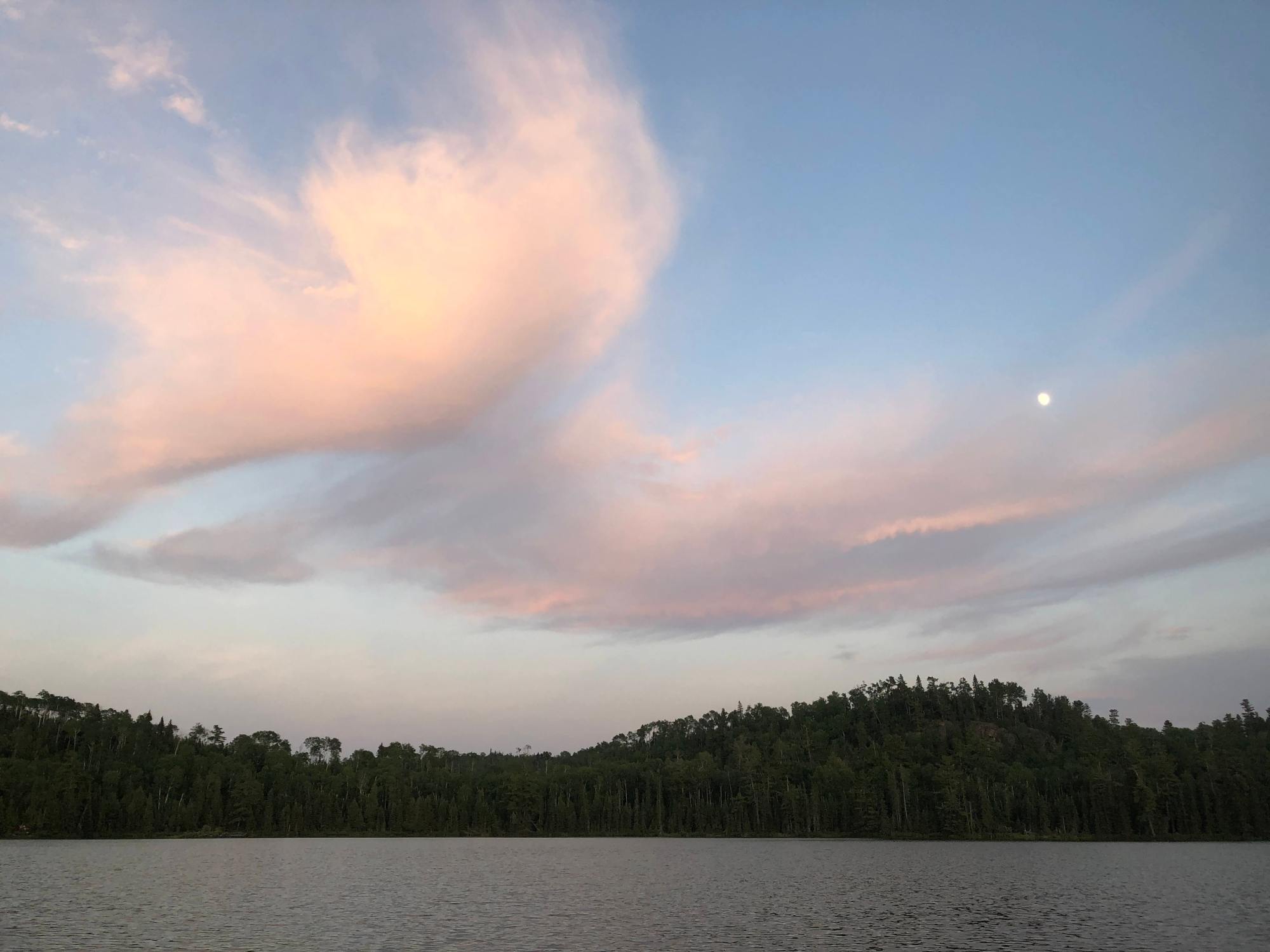 Dinner that night was delicious – instant ramen that Heather doctored up with eggs she’d carried in from her and Drayton’s chickens back in our neighborhood, chili sauce, sprinklings of sesame seeds. We put in extra seasoning packets and flourished in the salt. We ate our overflowing bowls down by the water. The air was thick with hunting dragonflies at first, and later we noticed hundreds, maybe thousands, of some kind of aquatic insect – maybe fishflies? stoneflies? – flying up, then down, then up, then down, in perfectly, oddly, straight routes. Another merganser swam slowly by. The sunset was orange, the lake was glassy. I waded around on the rocky bottom for a few minutes, before we left the flies and mosquitos and retreated to our tent and our blissfully soft double sleeping pad to companionably read side by side. (I read James Baldwin’s Another Country that trip, which pulled me from the Boundary Waters to New York City and also, back to Minneapolis, where our police force had just murdered another innocent Black man, George Floyd, a month before.)