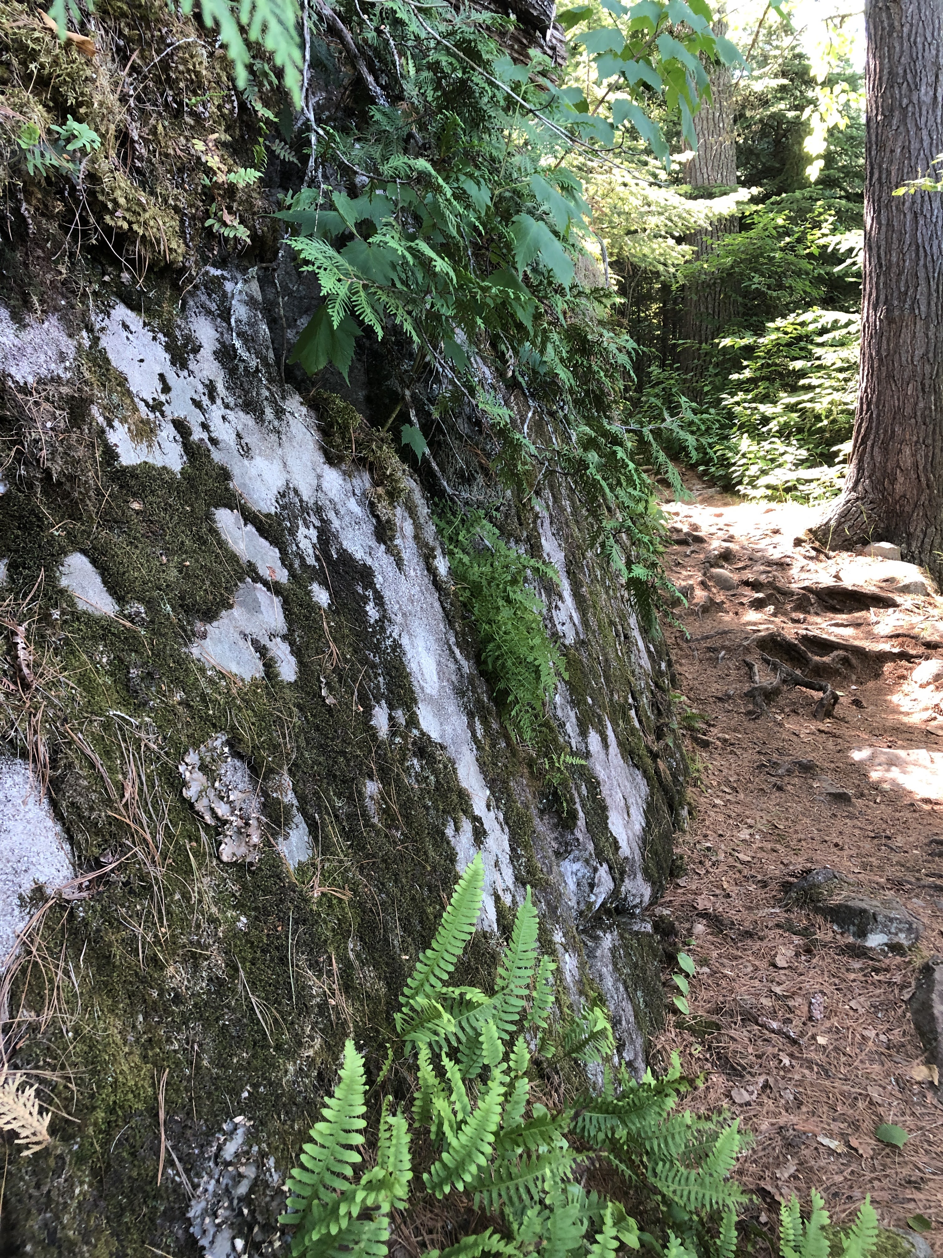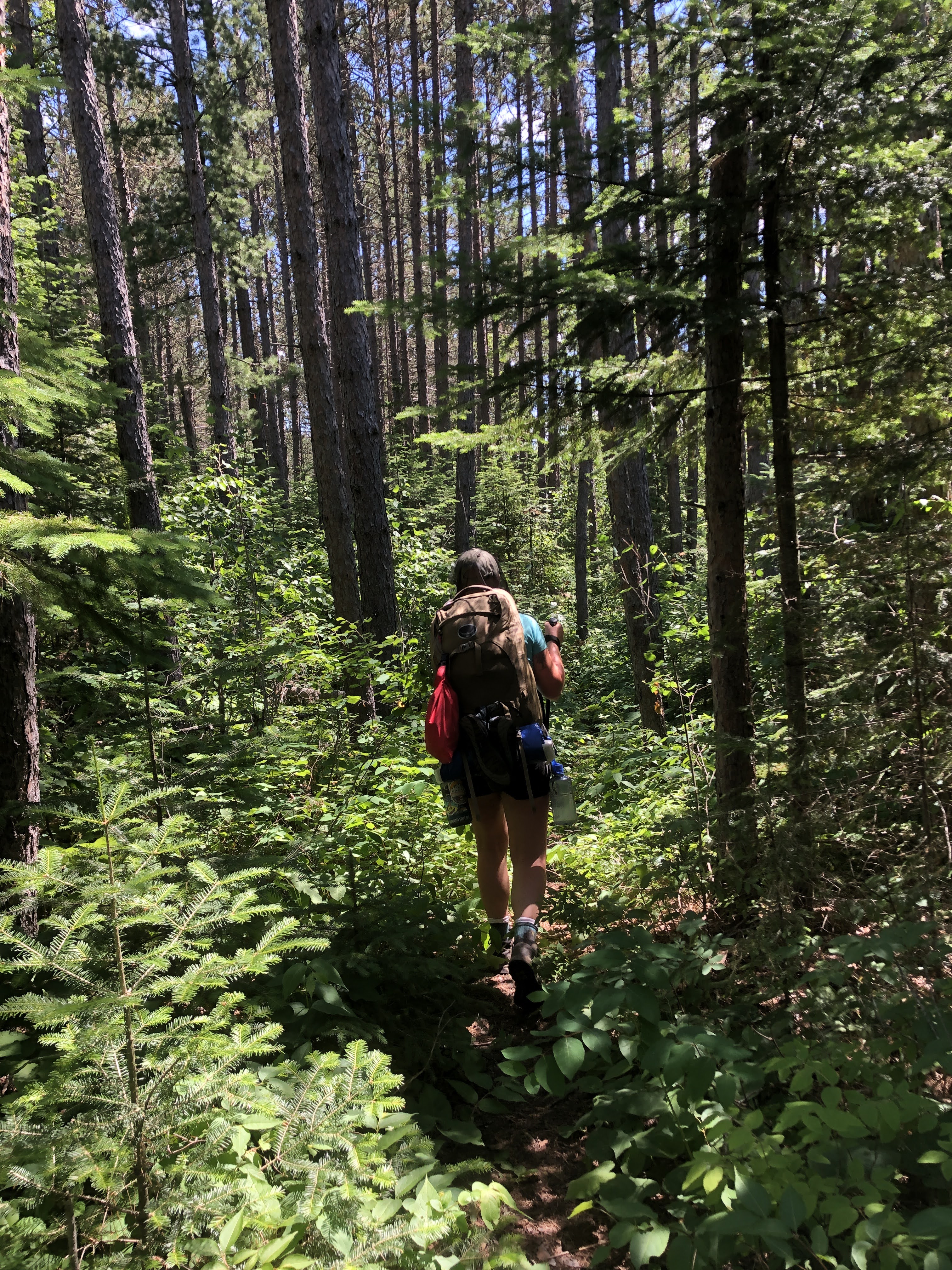 We stopped for a lunch break in one of these unburned oases, on the northeast corner of Loon Lake. I felt deeply exhausted – our packs were heavy, with lots of water and still most of our seven days of food – but mostly it was from keeping my balance on extremely uneven ground that was invisible underneath the vegetation. Also the constant sun exposure likely did not help. We sat on the ground, right in the middle of the trail, using our packs as backrests, and shoveled trail mix and tiny meat sticks into our mouths, hypothesizing about what the temperatures were. (Naturally, three minutes after we started hiking again, we passed a pair of crudely made, moss-grown wooden armchairs right on the lakeshore. For more than a mile, I dreamed about what it would be like to have sat in one. They had backs and everything.)