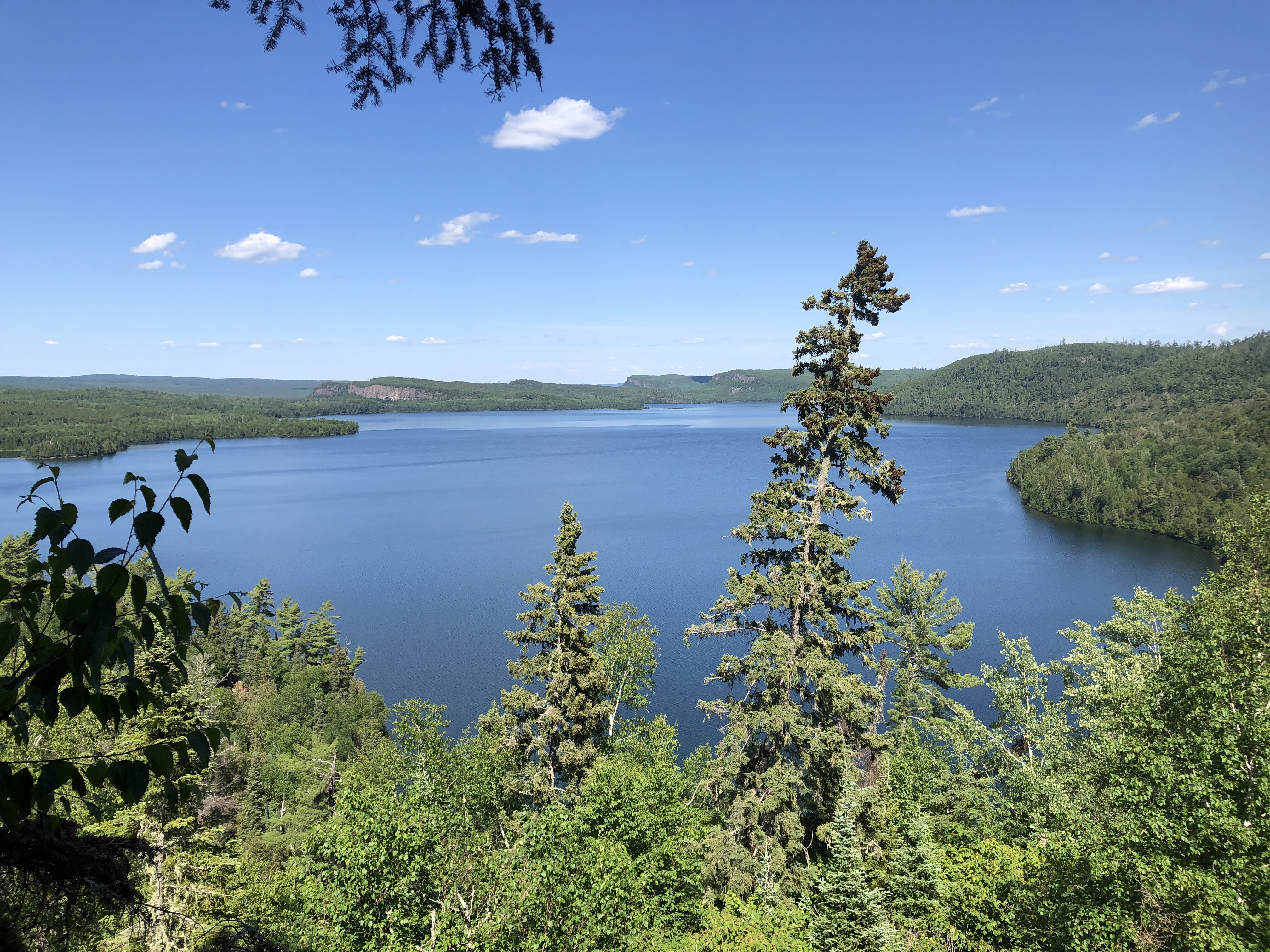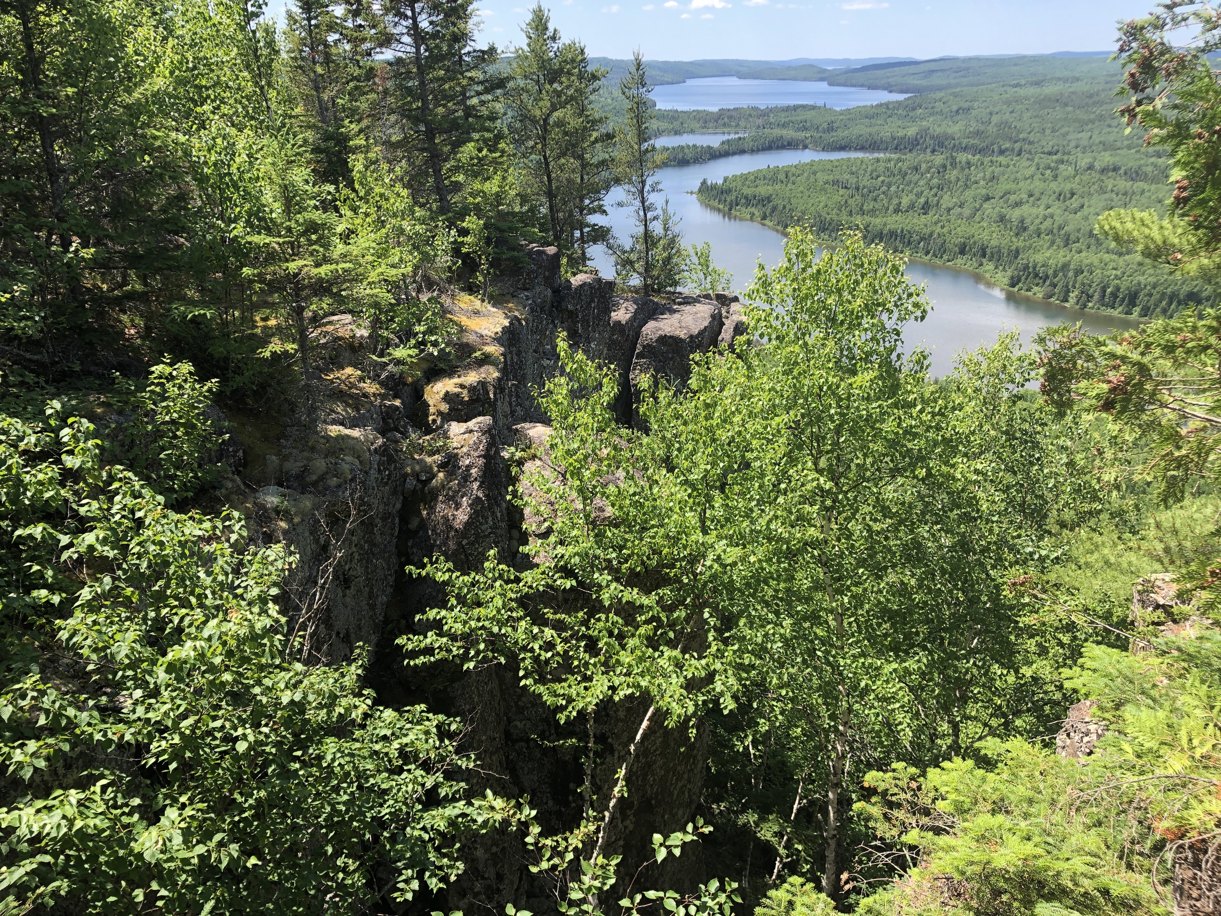 We started the day’s hike, again, late and already glowing with sweat that would never evaporate in the soupy air. But the hiking was better. We were out of the burn zone and the trail was in slightly better shape, traversing either the spruced forest or dark, lumpy cedar swamps. Once we saw a perfect, plump, pink ladyslipper. There were a lot of steep sections but that meant a lot of jaw-dropping vistas, green as far as the eye could see, strange rock formations and glittering, slender lakes far below. We timed snack breaks for these vistas, when we could burst out into the open air from the trees and eat and drink in the slight breeze.