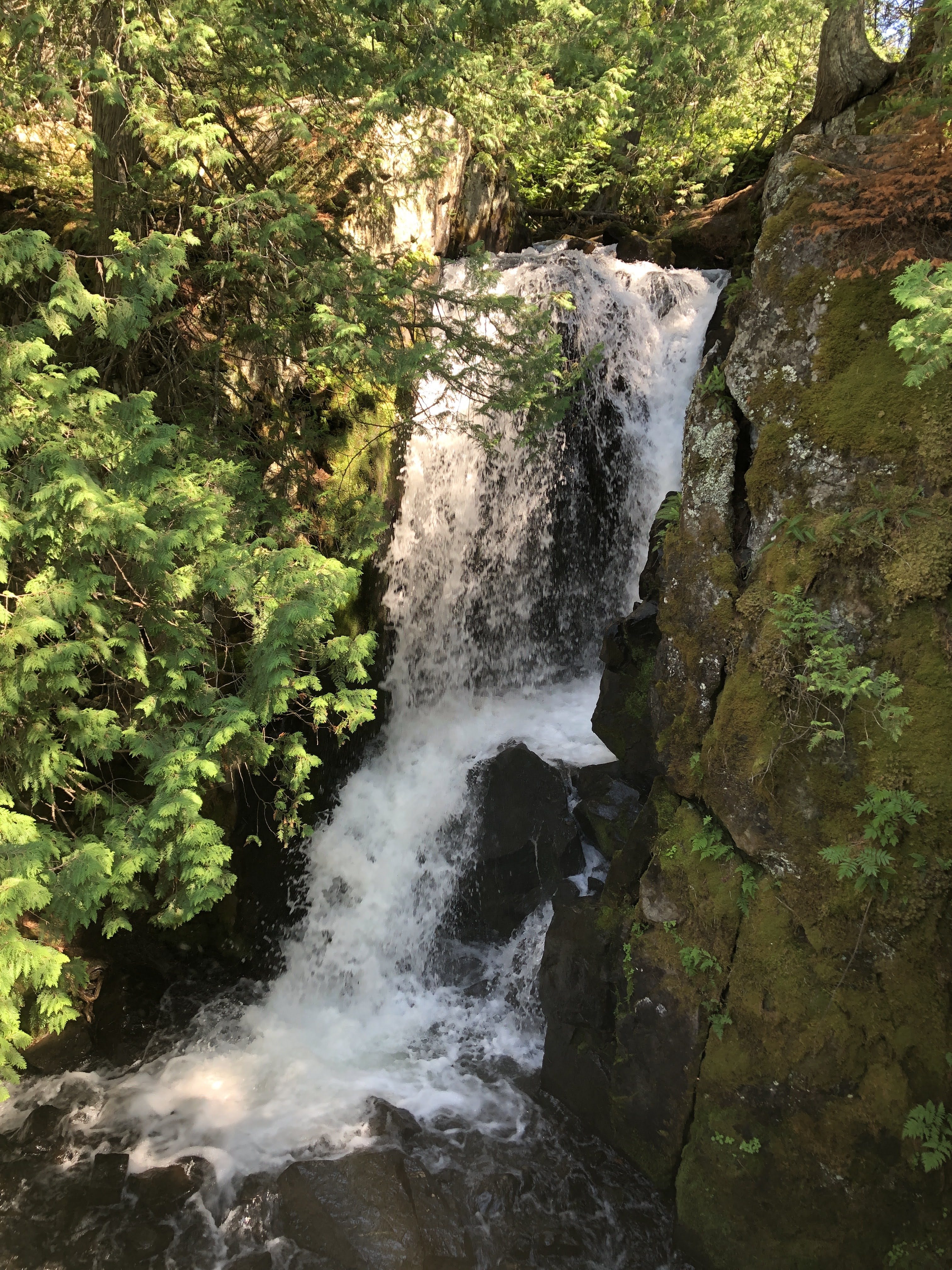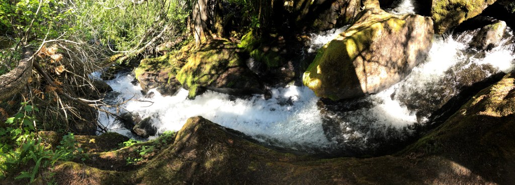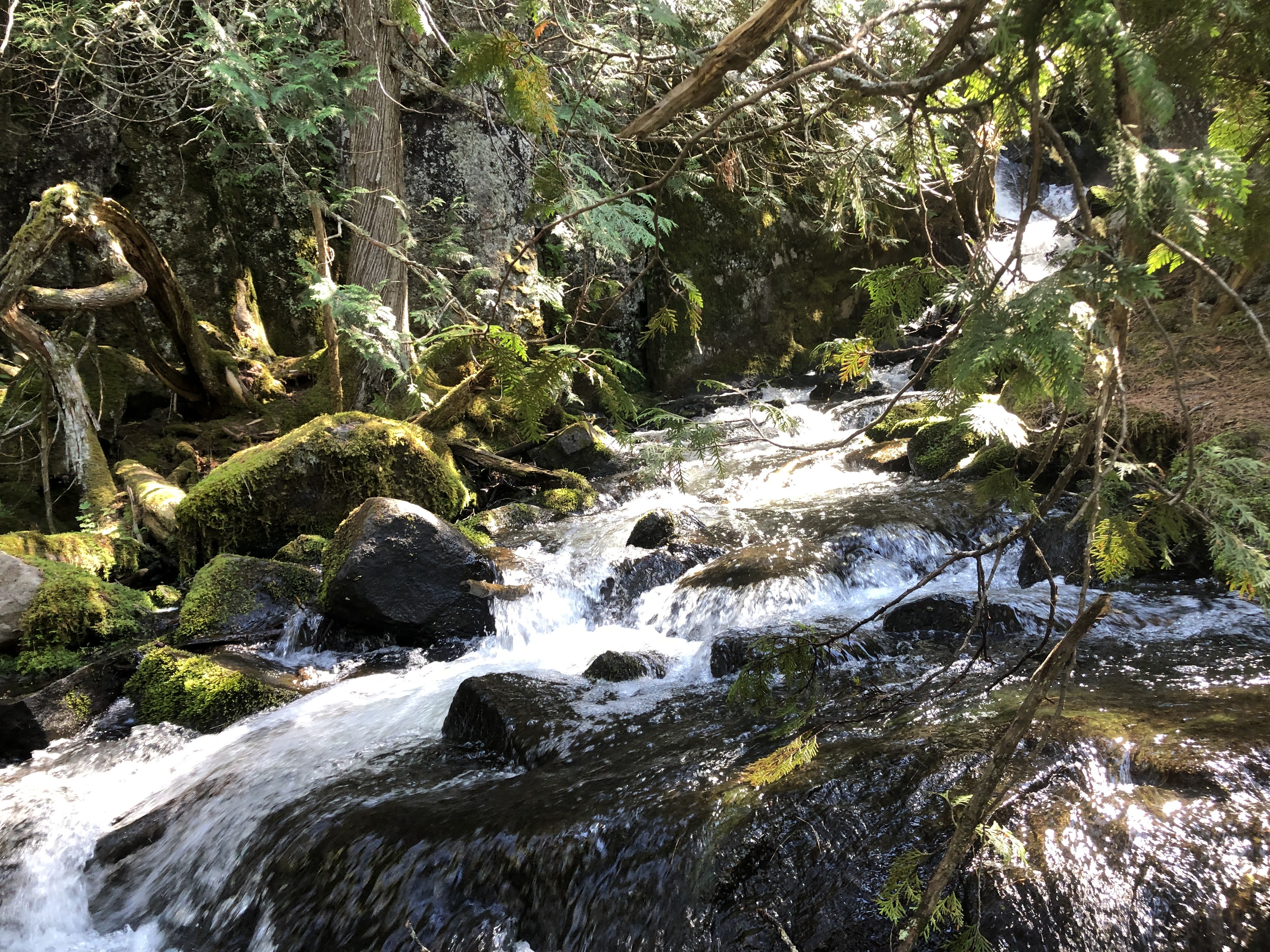 Heather and I left our packs at the top, pulled out the squeeze water filter (we also had a gravity filter for when we made camp every day), and hurried down the broad, beautiful trail to the water. It was just mindboggingly beautiful, a wonderland of rapids and boulders and moss, with one enormous falls that then kept falling and churning for hundreds of feet to the lake far below. Like I’d done at Bridal Veil Falls the day before, I squatted over the water and splashed it over my face and head and arms and legs in some desperation, and it still wasn’t quite cold enough. We filtered another liter and a half each – we’d just run out of our water supply, timing it for this water crossing marked on our map. I drank half a liter and filled it back up again.