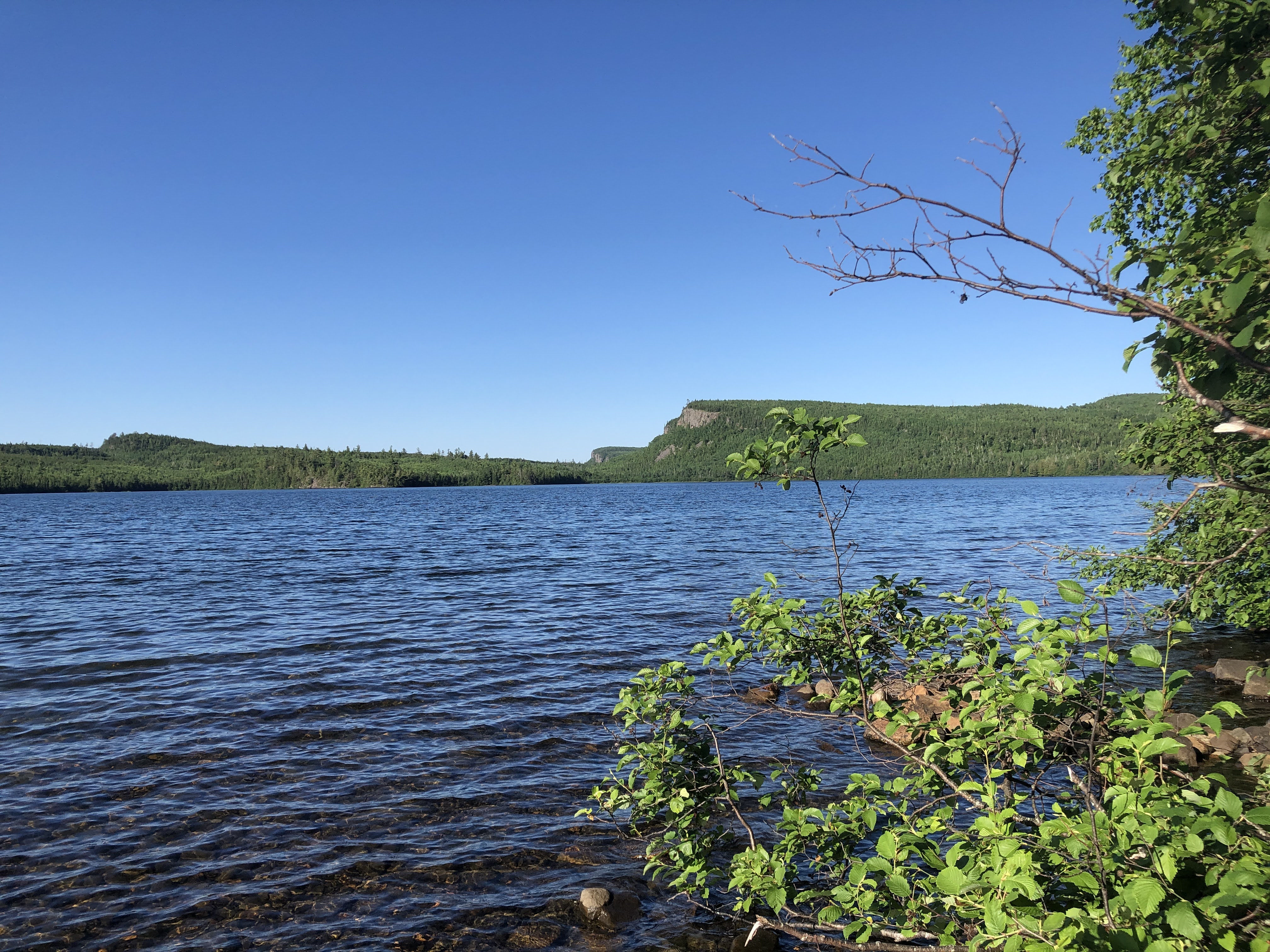 We set up camp – even those motions left us slicked with sweat again, it was so humid. The site was grassy up top, with the view of the lake from the tent pads mostly blocked by trees. Low creeping juniper bushes merged with the basalt along the lakeshore. A merganser swam by with eight perfect chicks, and I saw a frog who still had a bit of a tail, who hid himself in the mud when he noticed me. We finished the small last of Heather’s vodka and lime supply. Now in the wilderness area, there was no sound of motors, and we realized we hadn’t seen or heard a single other human being all day – there’d been no more road crossings with distant cars, no fishing boats. Certainly not any other hikers.