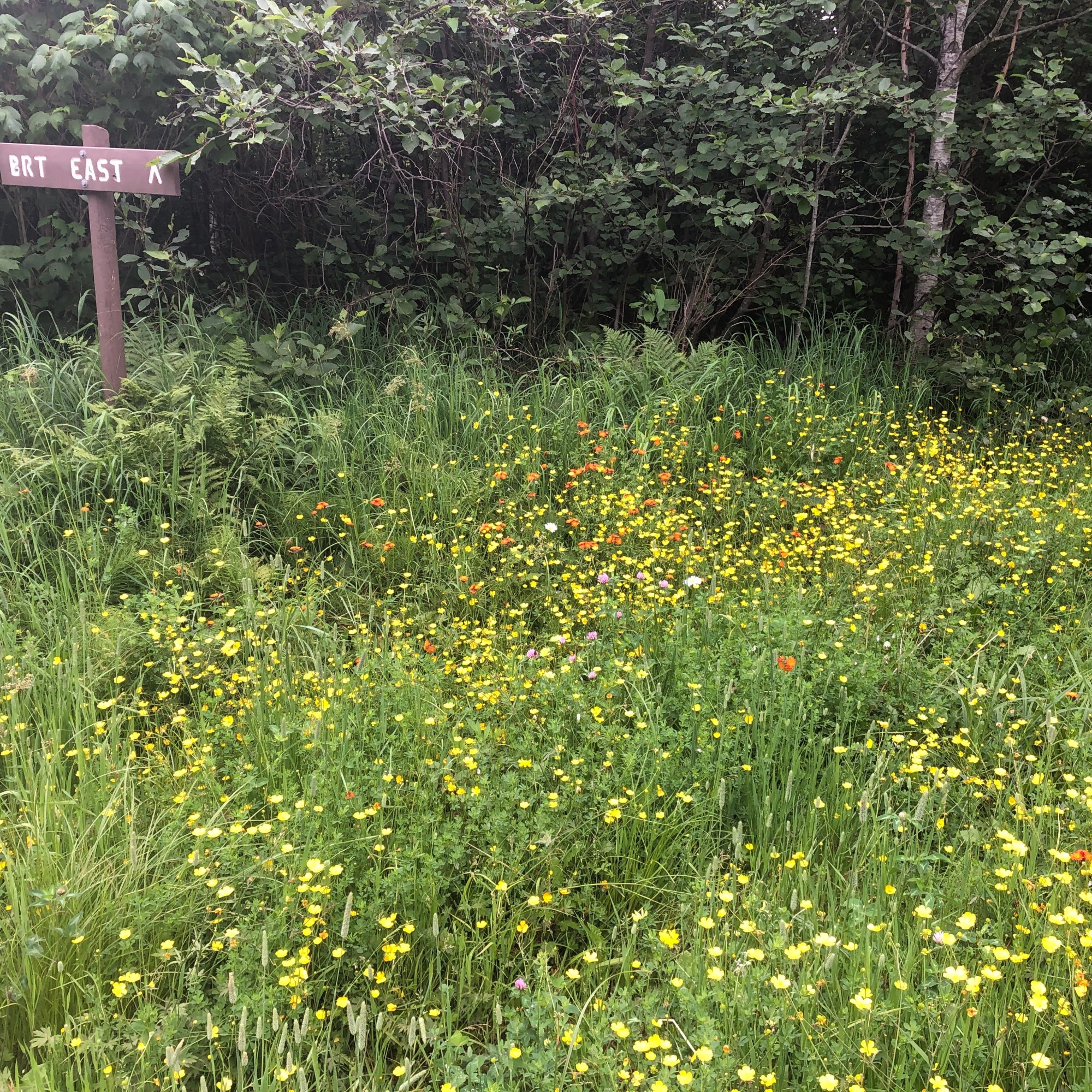 Then we were into densely-tree lined cross-country ski trails, broad but overgrown with tall grasses and asters. The trail edges were knotted walls of alders and honeysuckle, and the mosquitos were thick and incessant. Sometimes the trail deviated from the old ski trails and became a whispered suggestion through the forest, marked by sporadic tics of blue tape tied to the branches of shrubs. I had a GPS app on my phone that saved us twice at squirrely, unmarked intersections, as we waded through an avalanche of ferns. Sometimes we just went the way it felt like some human had moved before. We ate our lunch snacks sitting in bee-buzzing wildflowers by the side of a gravel road crossing, the sun-lit opening slightly less buggy than the shady woods.